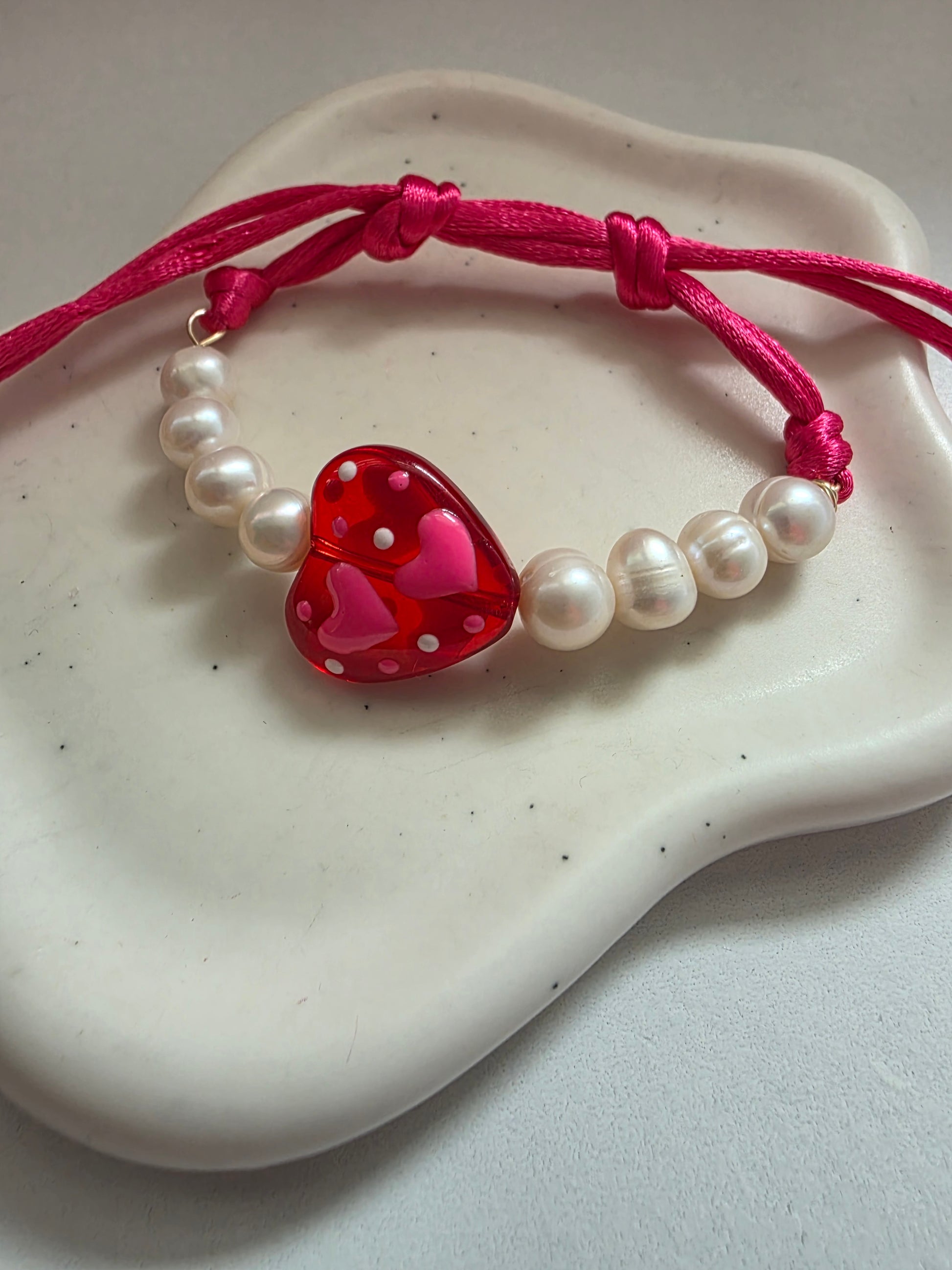 Brazalete ajustable en hilo con charm de corazon en murano y perlas cultivadas