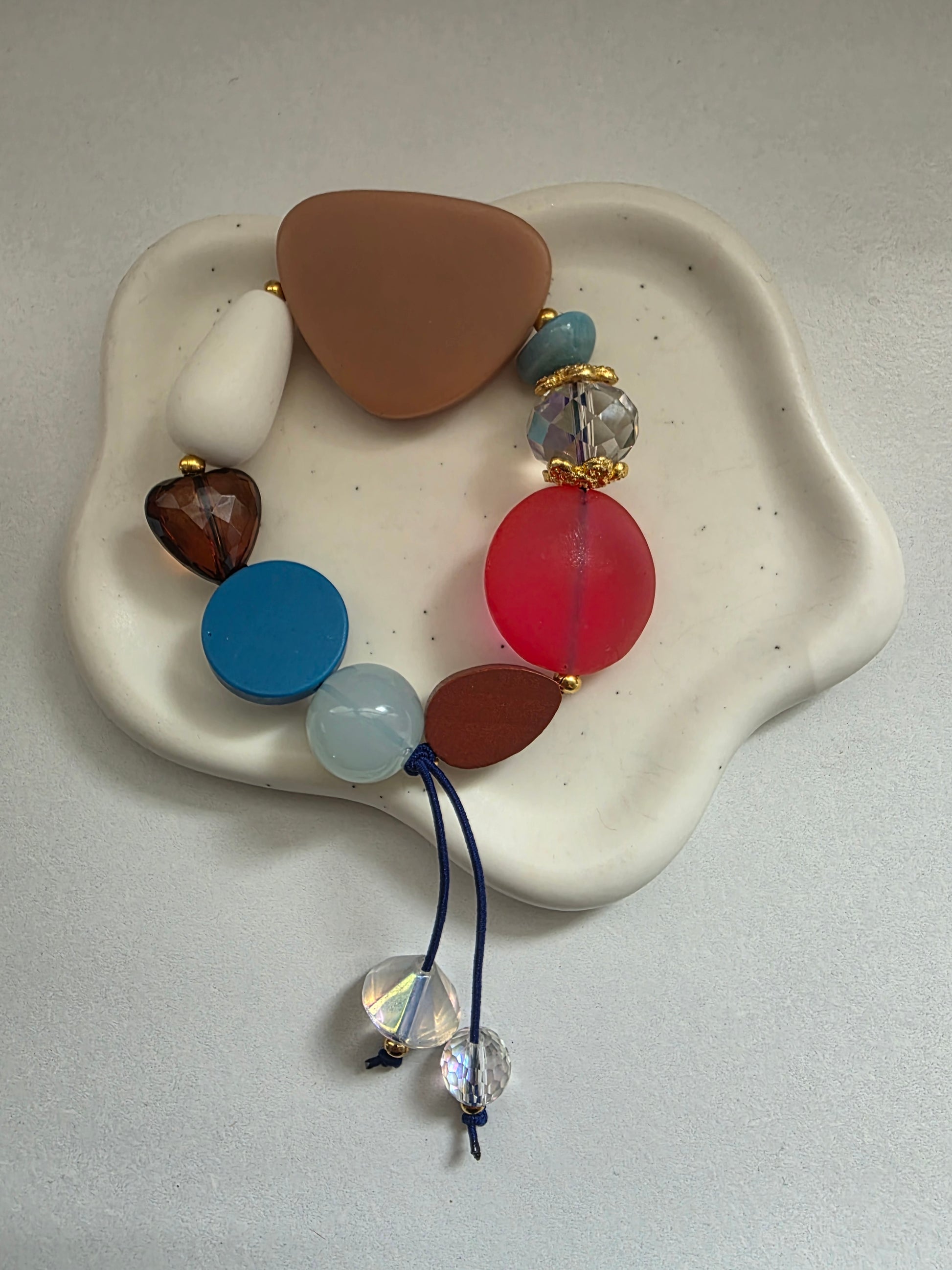 Brazalete ajustable en elastico con combinacion de piedras semipreciosas, resina y cristales. Con detalles gold plated 18k